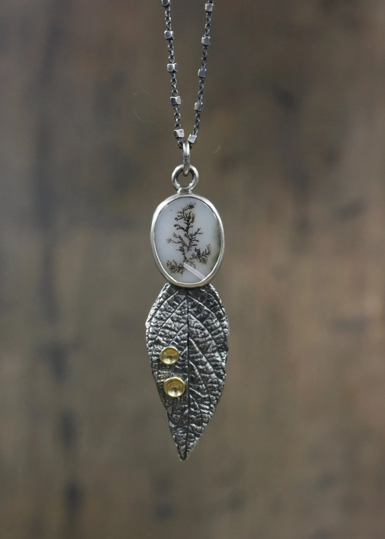Botanical Lichen Leaf with Dendritic Agate Pendant